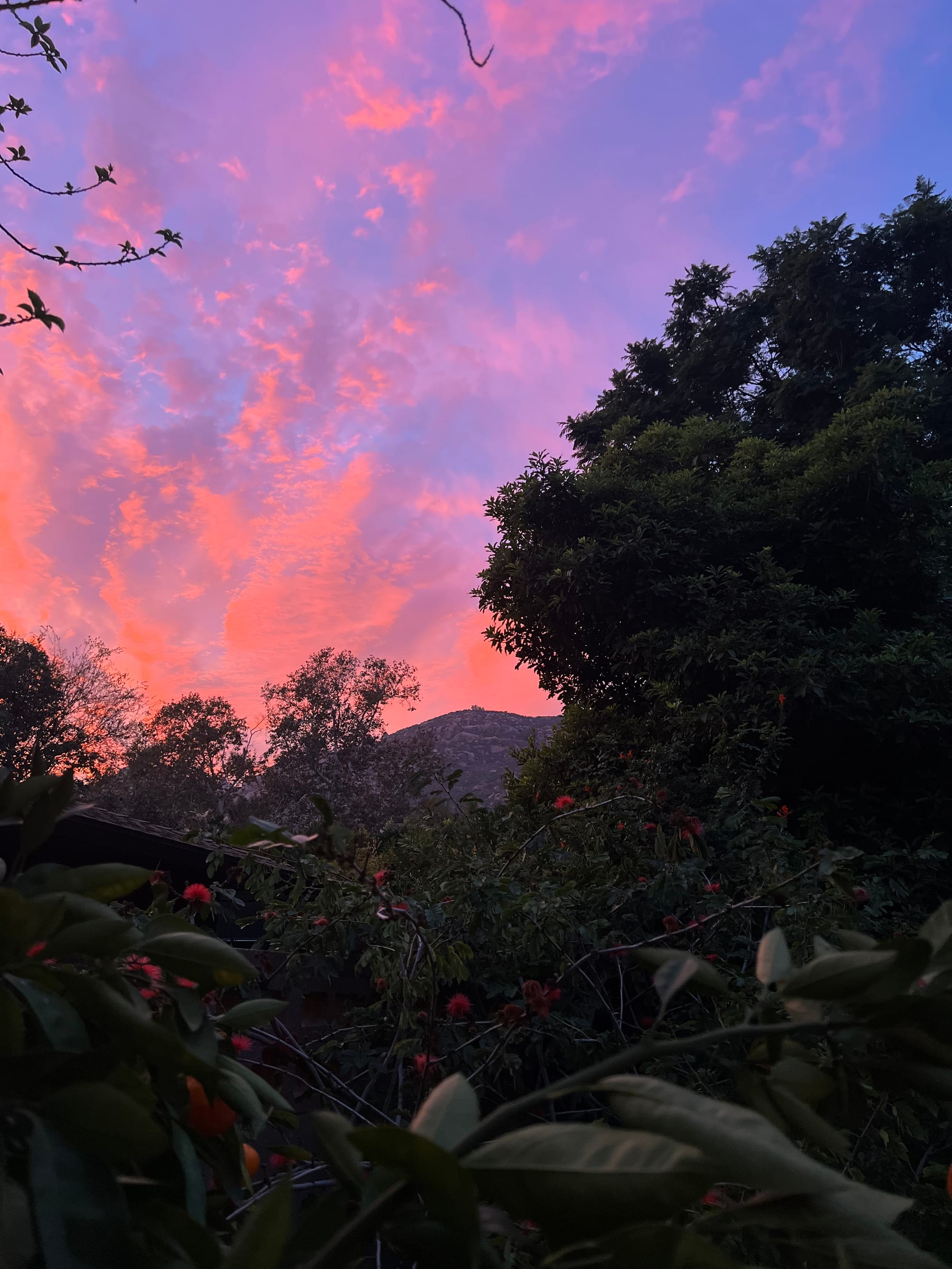 Vibrant coral and purple clouds illuminate the evening sky above Mount Rubidoux, framed by silhouetted trees and flowering plants at Evergreen Cemetery. (Michelle) Have a photo that captures the spirit of Riverside? Share it with us and help celebrate the beauty of our community!
