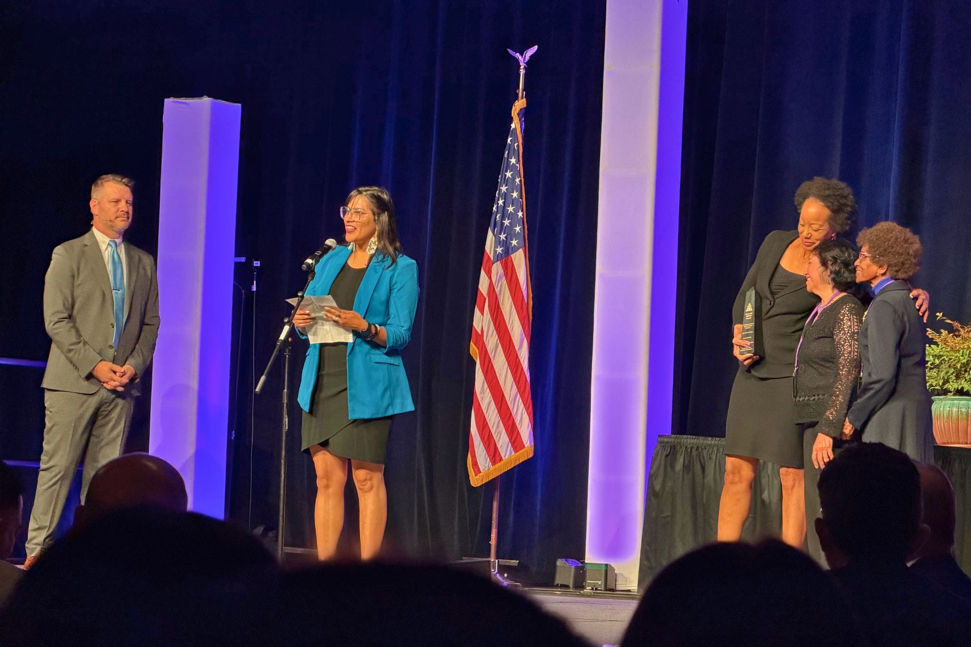 Civil Rights Institute Executive Director Sabrina Gonzalez accepts the Riverside Hero Award alongside Board President Lana Wilson, co-founder Rose Mays and Sarika Acharya, representing co-founder Lalit Acharya, at the State of the City address Jan. 28. Chambers of Commerce President and CEO Nicholas Adcock (left) presented the award.