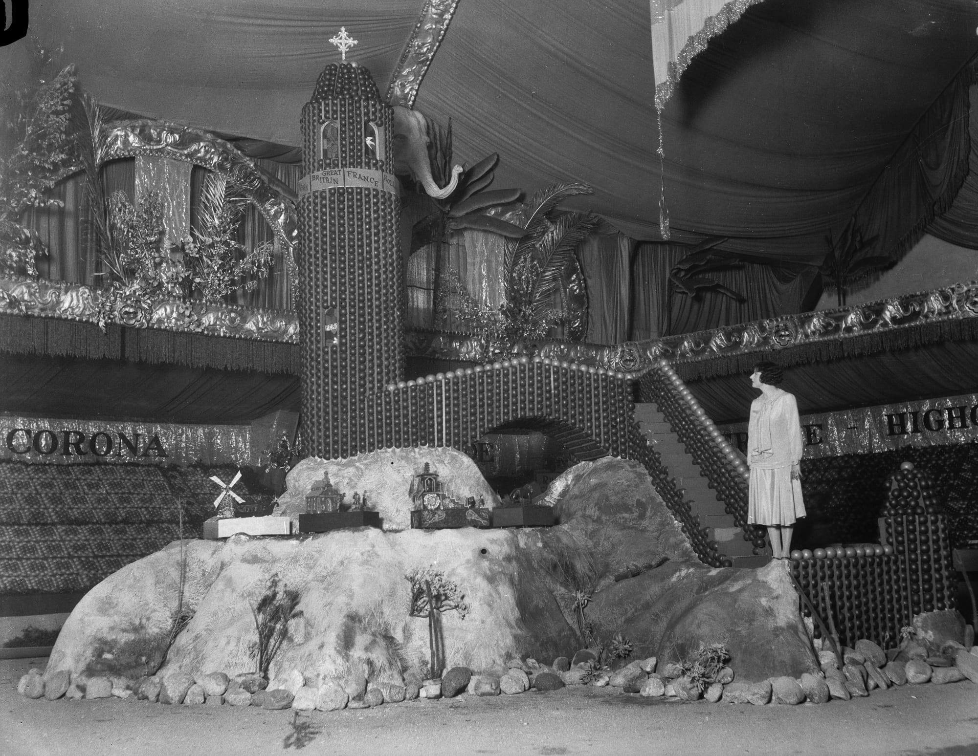 Shortly after the dedication of the Frank A. Miller Testimonial Peace Tower and Friendship Bridge on Mount Rubidoux on December 13, 1925, Charles Rouse, owner of downtown Rouse's Department Store and chairman of the Riverside Chamber of Commerce, suggested to the Chamber of Commerce a display for the Sixteenth Annual National Orange Show in San Bernardino. Rouse proposed an exhibit consisting of a miniature replica of the Peace Tower and Bridge. E. J. Rose, a Los Angeles artist, was hired to design the exhibit. The Tower and Bridge were covered with "luscious golden Riverside oranges." Charles Rouse headed the committee planning the exhibit and was assisted by J. H. Wilson, J. R. Bowden, Ray Wolfe, and Fred Schweitzer.