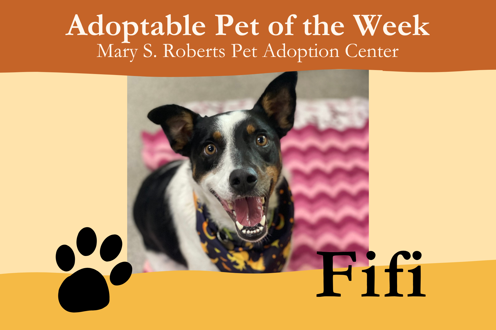 Come meet Fifi and all the adoptable pets at the Mary S. Roberts Pet Adoption Center in person. Stop by any day except Tuesdays, from 12 p.m. to 7 p.m., or learn more at petsadoption.org.