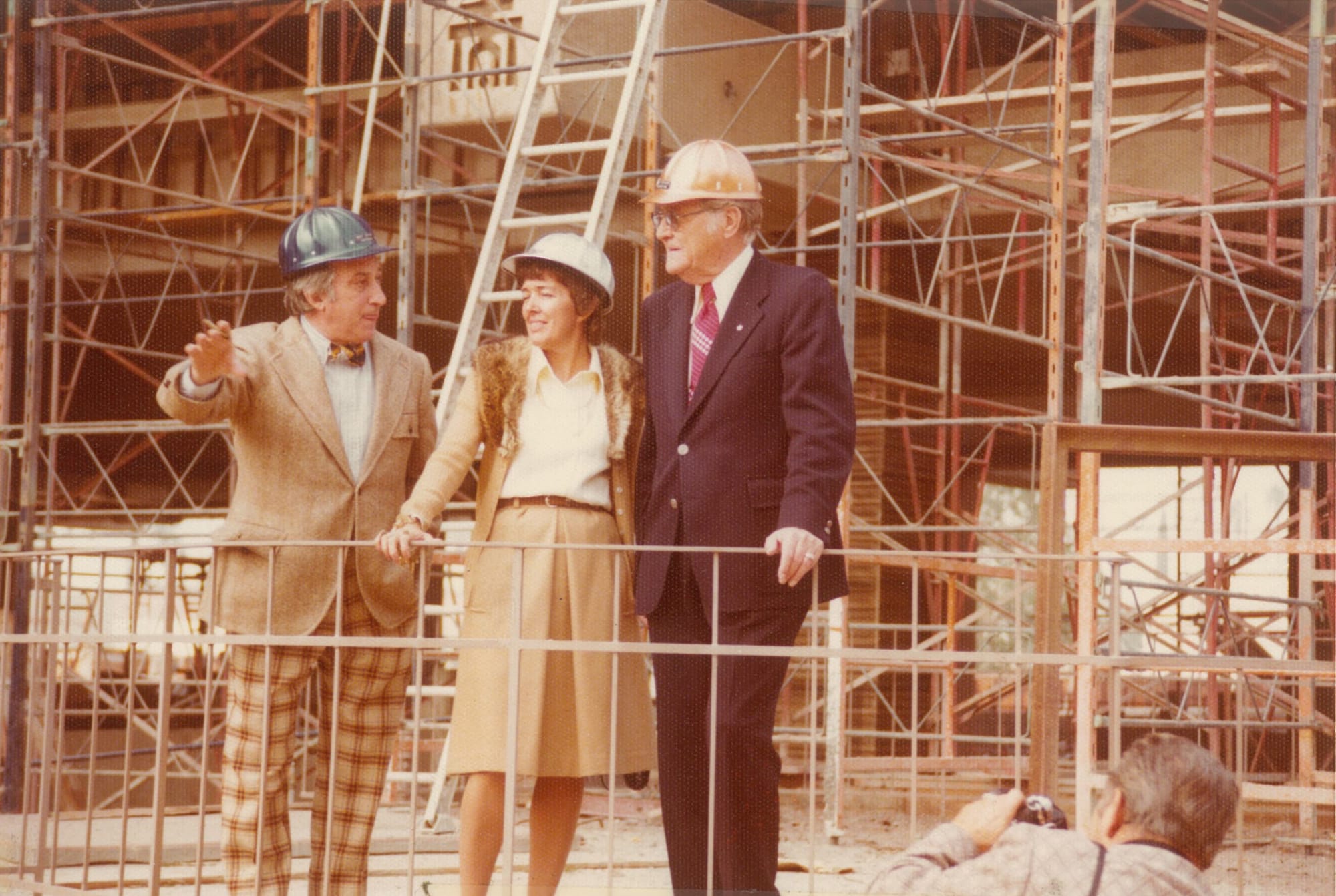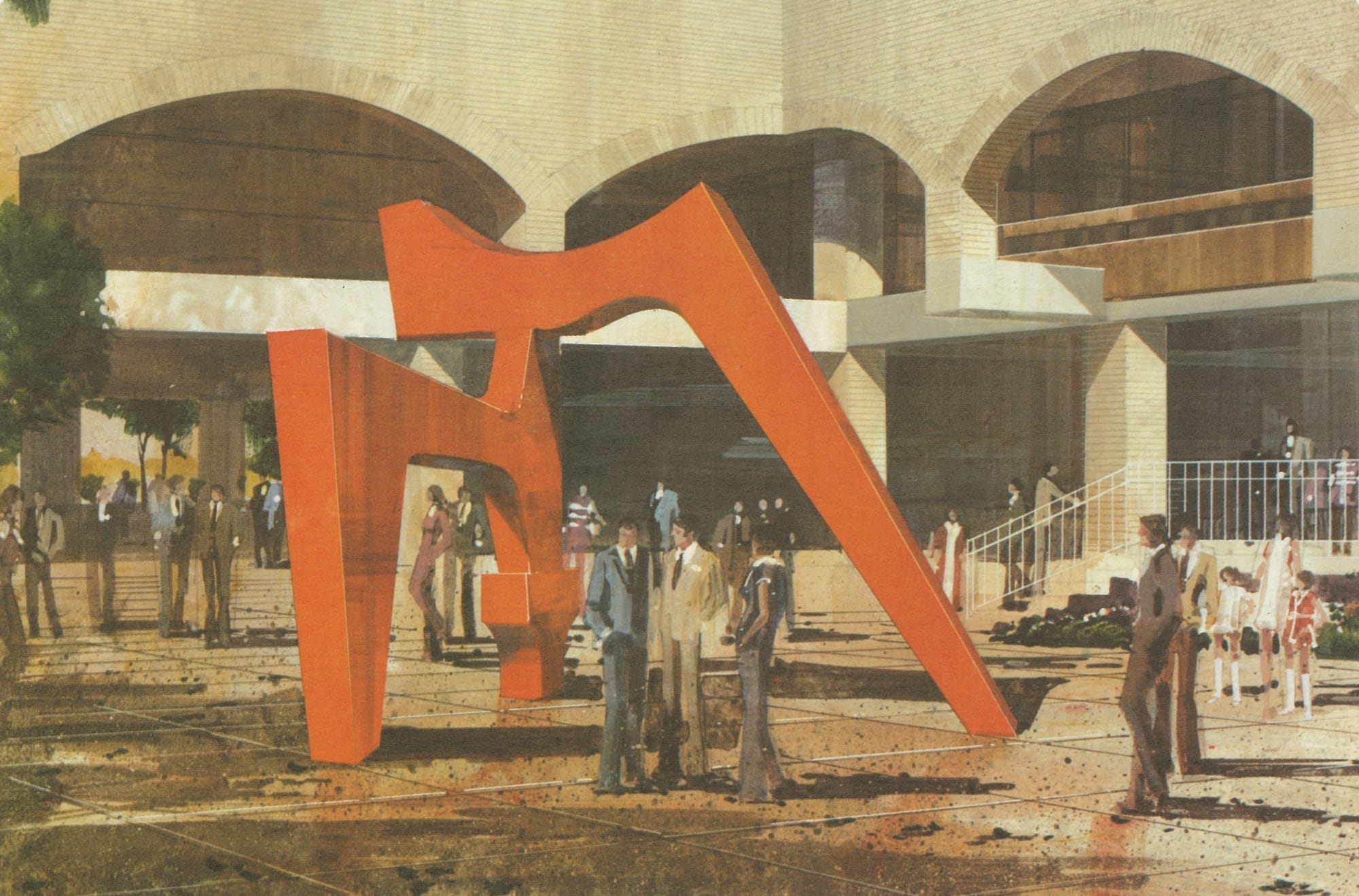 From left: Sculptor James Rosati, Mayor's wife Dottie Lewis, and Mayor Ben Lewis tour City Hall construction site in 1974; Rosati's orange 'Tripod' sculpture stands in front of the newly completed City Hall in 1976. (Courtesy of Ward 1 Councilmember Phillip Falcone)