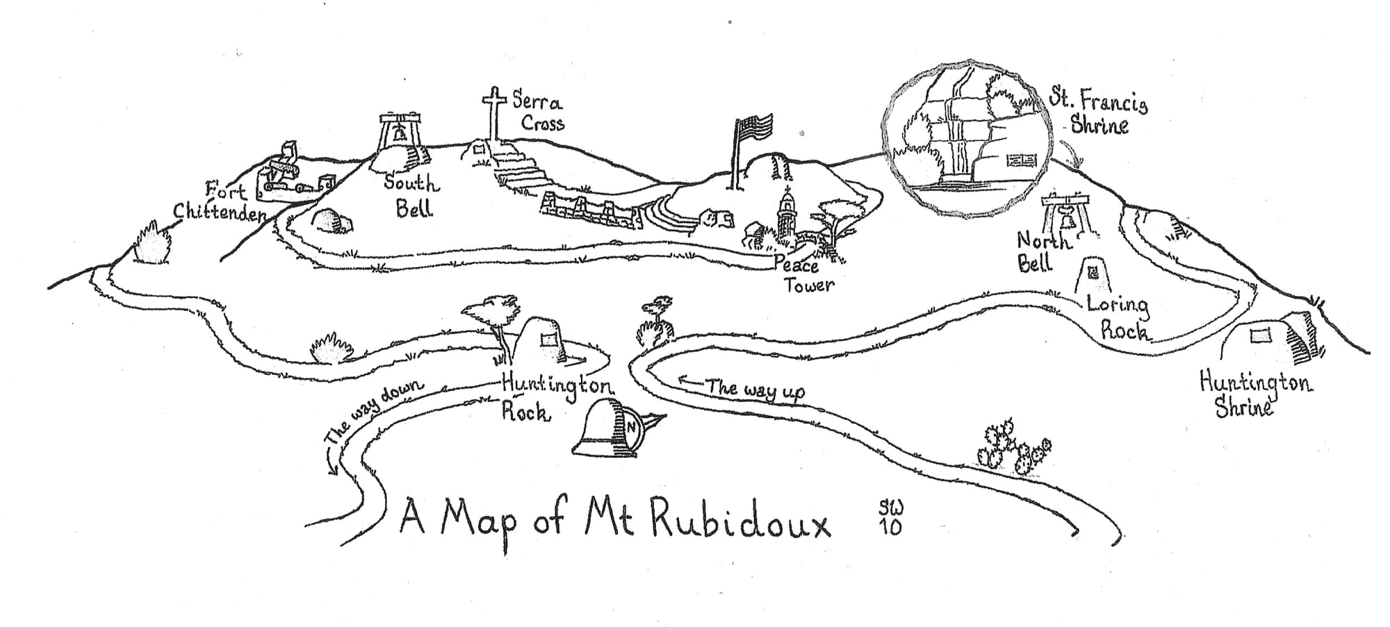 Over the years, the area known as Fort Chittenden fell into disrepair. Some years ago, many of the chains on the mountain were missing. George Flower, the late president of the Friends of Mt. Rubidoux, went to Long Beach, obtained links of chain, and helped replace many of the missing sections. At one point, some of the stone pillars were hanging over the edge, held up only by sections of the chain. Several years ago, the Riverside Parks and Recreation Department invested time and funds in fixing the area. Today, the area is clean with the stone pillars and the anchor chains properly in place. Yet many people are unaware of the site's name, Fort Chittenden, or its history. As you travel down from the cross area at the peak, you cross over the Ben Lewis Bridge. After dropping down from the bridge, Fort Chittenden is the open area to your left. Stop the next time you walk the mountain and contemplate the history connected with Hiram Chittenden and the fort in his honor. Think about the fort that is "Keeping a High Watch" over the city.