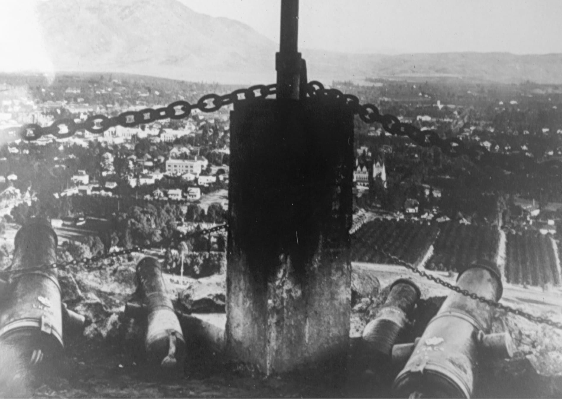 Whatever happened to the four cannon at Fort Chittenden, which were helping keep a high watch over the city? As with so many items from Riverside history, we do not know. Except for one. One of the cannon, the smallest of the four, from a ship named the Penelope, ended up in the collection of the Museum of Riverside. According to the accession record card, the cannon was a gift to the museum in November 1976, having been found on the mountain around 1970. The cannon measures 2 feet 8 1/2 inches, but weighs a lot. I remember attempting to lift it when it was brought over from the Riverside Museum to the Mission Inn Museum for an exhibit from July through October 2013 called "A Community's Love Affair with a Mountain."
