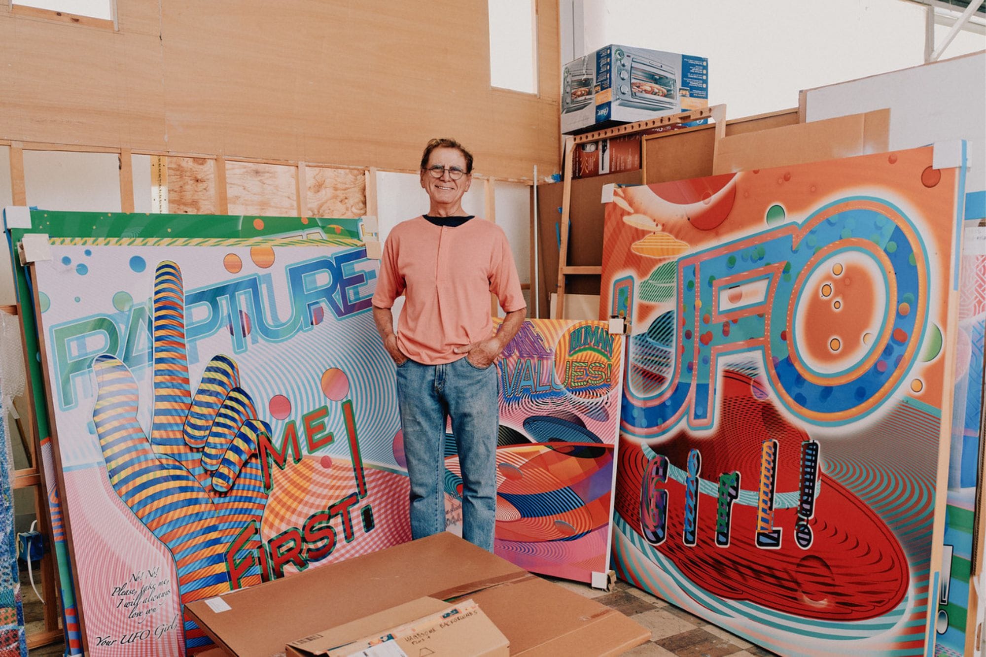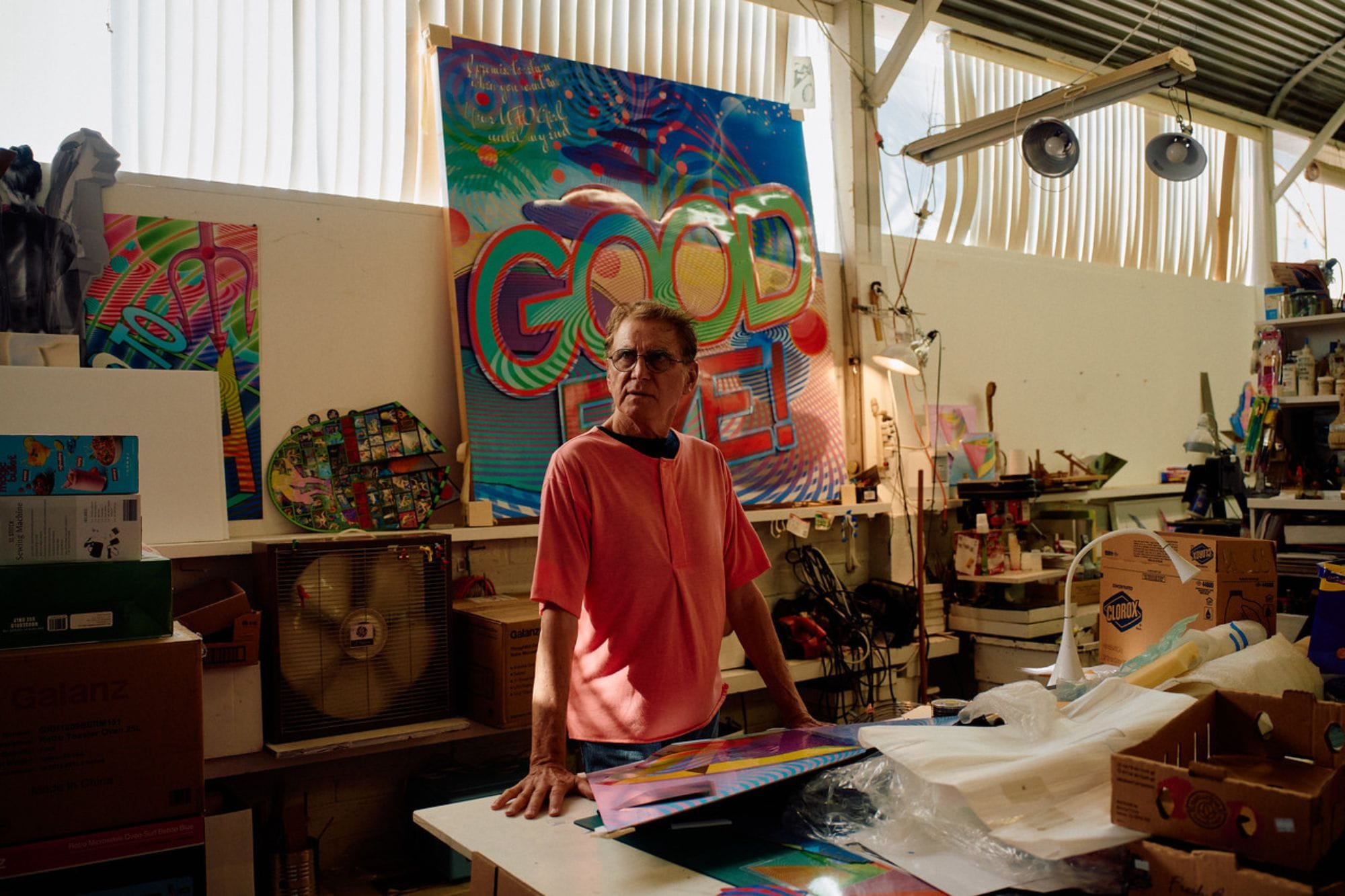 From left to right: John Dingler outside his studio home beside his 1968 Chevy van near the railroad tracks, John with his vibrant digital artworks featuring geometric forms and political commentary. (David Fouts)