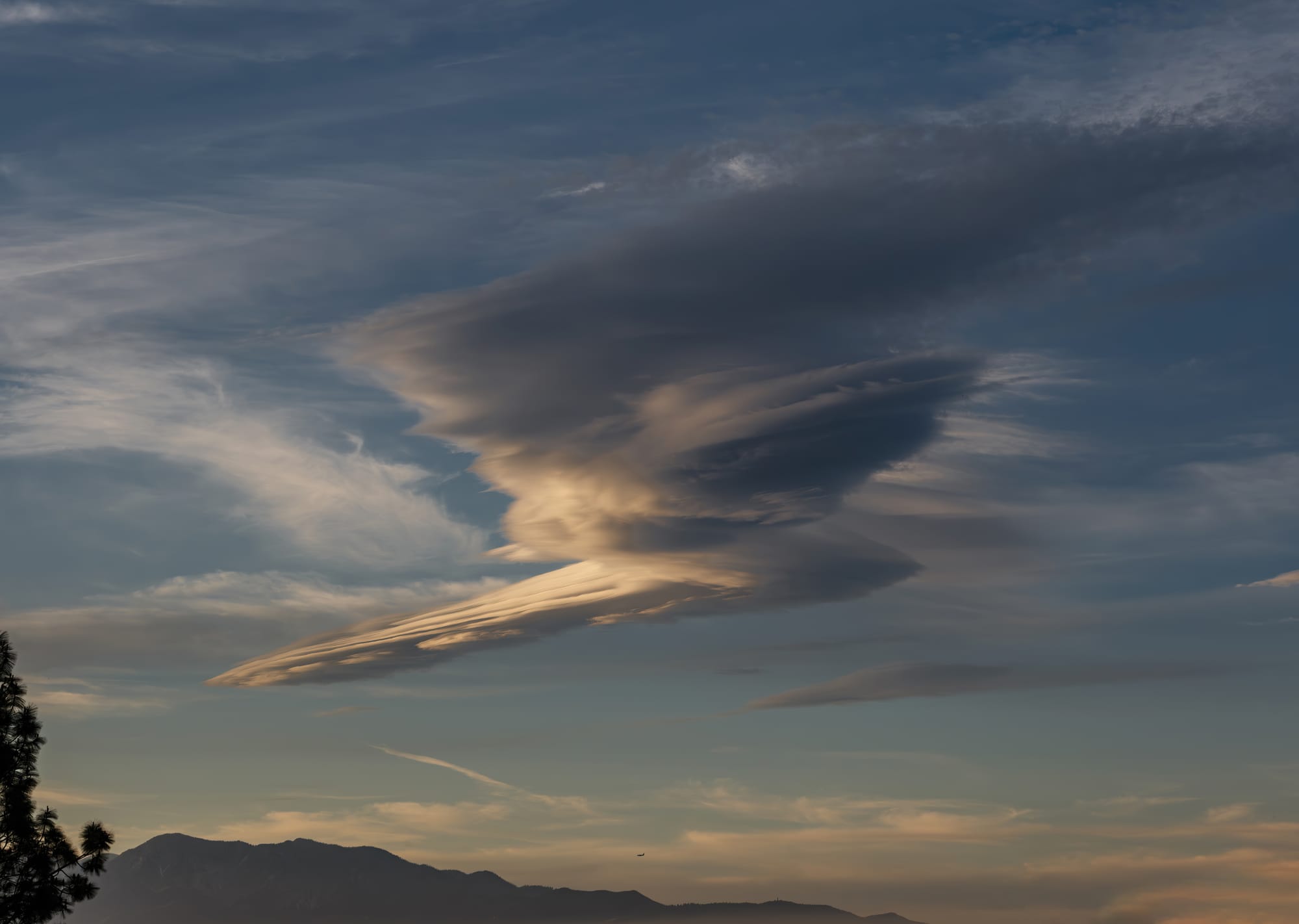Ten minutes before sundown, the scene was understated. The lenticular's layered structure sat in muted silver. Nearby clouds at scattered elevations carried the faintest hints of peach — easy to overlook, easy to walk away from. But the best was yet to come. This formation reminded me of the Starship Enterprise.