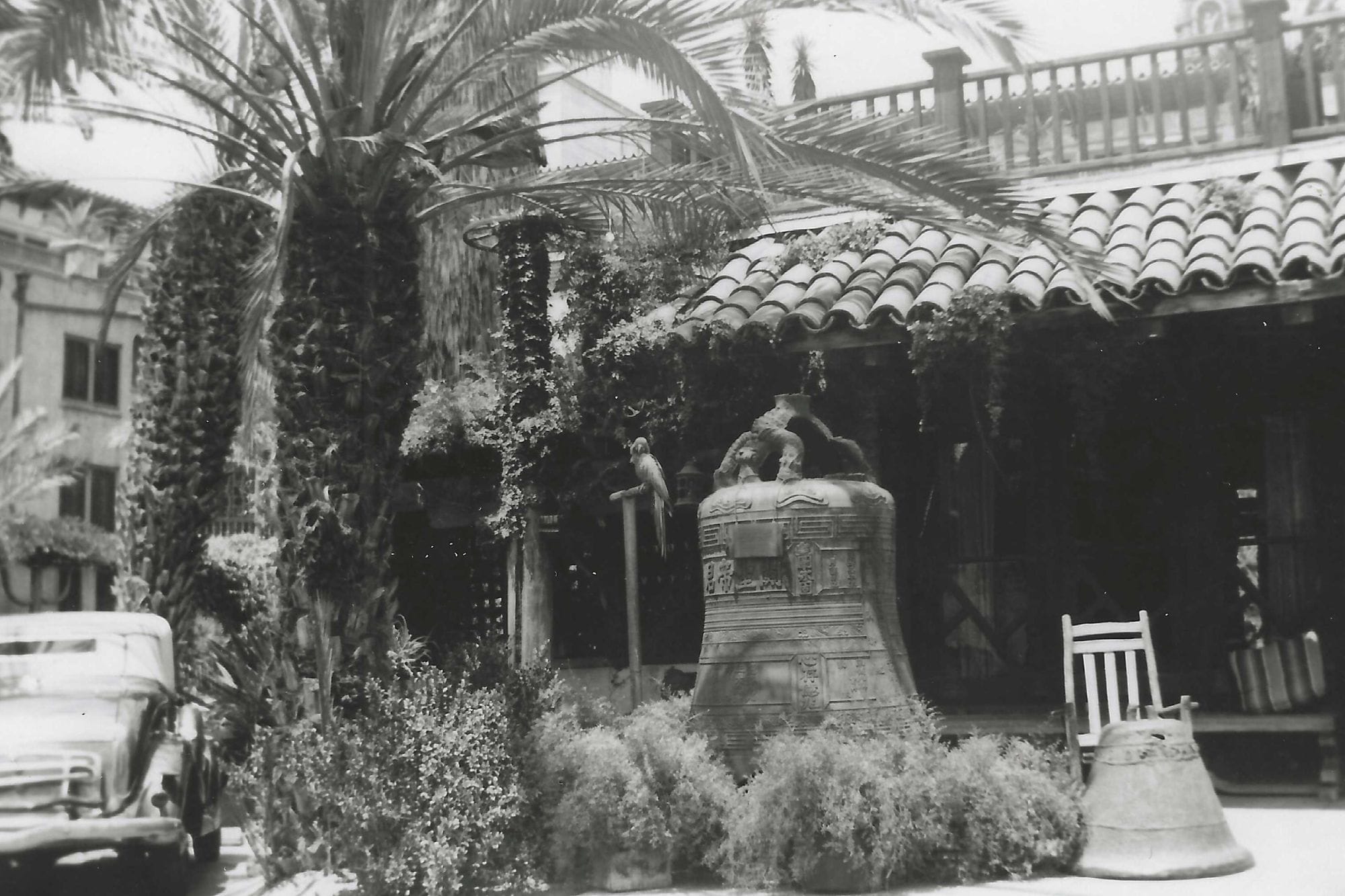 In 1948, the Old Adobe was torn down to build a large swimming pool in the Court of the Birds. The Nanking Bell was moved then and soon seen near the lily pond in front of the Campanario.