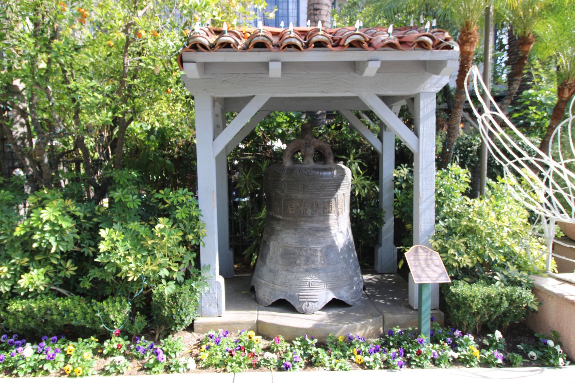 The Nanking Bell, or Nanjing Bell as it is now called, was moved to its present location along the front walkway in 2010. A crane lifted the bell onto an elevated platform under a tiled roof pergola. Check out this noteworthy bell the next time you are in downtown Riverside.