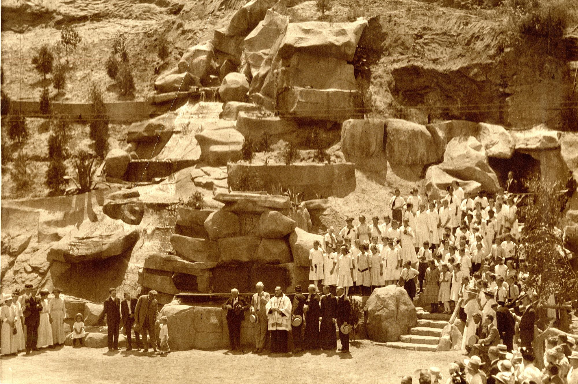The shrine consisted of the central faux rock portion with the waterfall to the left (north) and a small grotto with a door to the right. A mosaic was placed on the top of the shrine with a place for two tablets. The tablets were not present in time for the dedication. The bronze tablets for the Humane Society and the Audubon Society arrived shortly after the dedication and were placed into their proper locations.