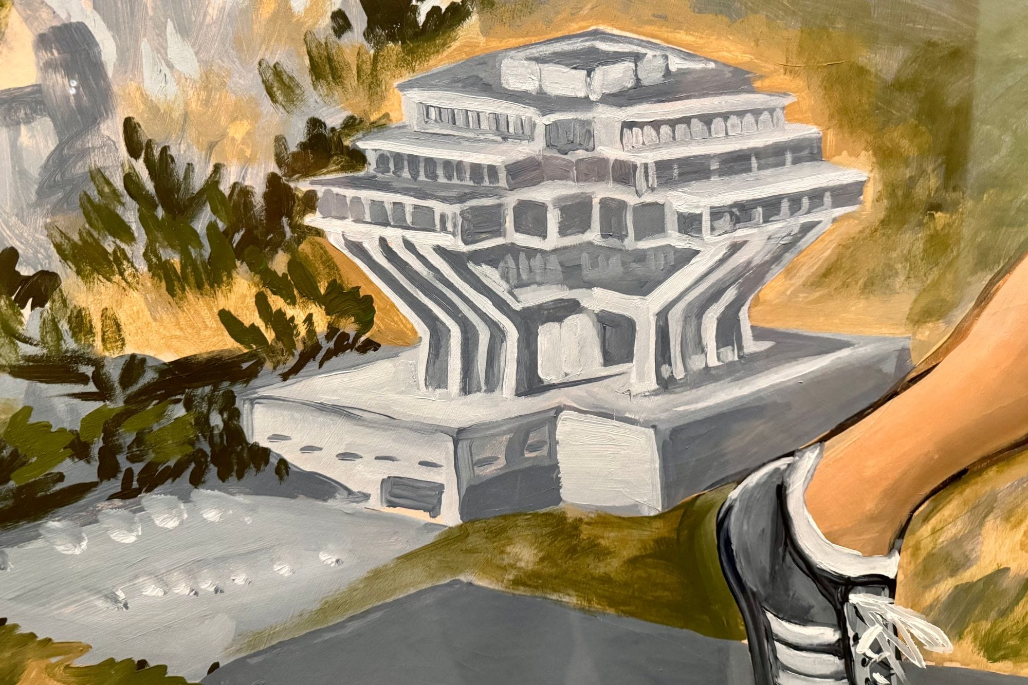 Yolanda's series of running paintings are the only works in the exhibition that exist within a recognizable space. They portray her running around La Jolla and the UC San Diego campus. The Geisel Library is featured prominently in one of the larger paintings.