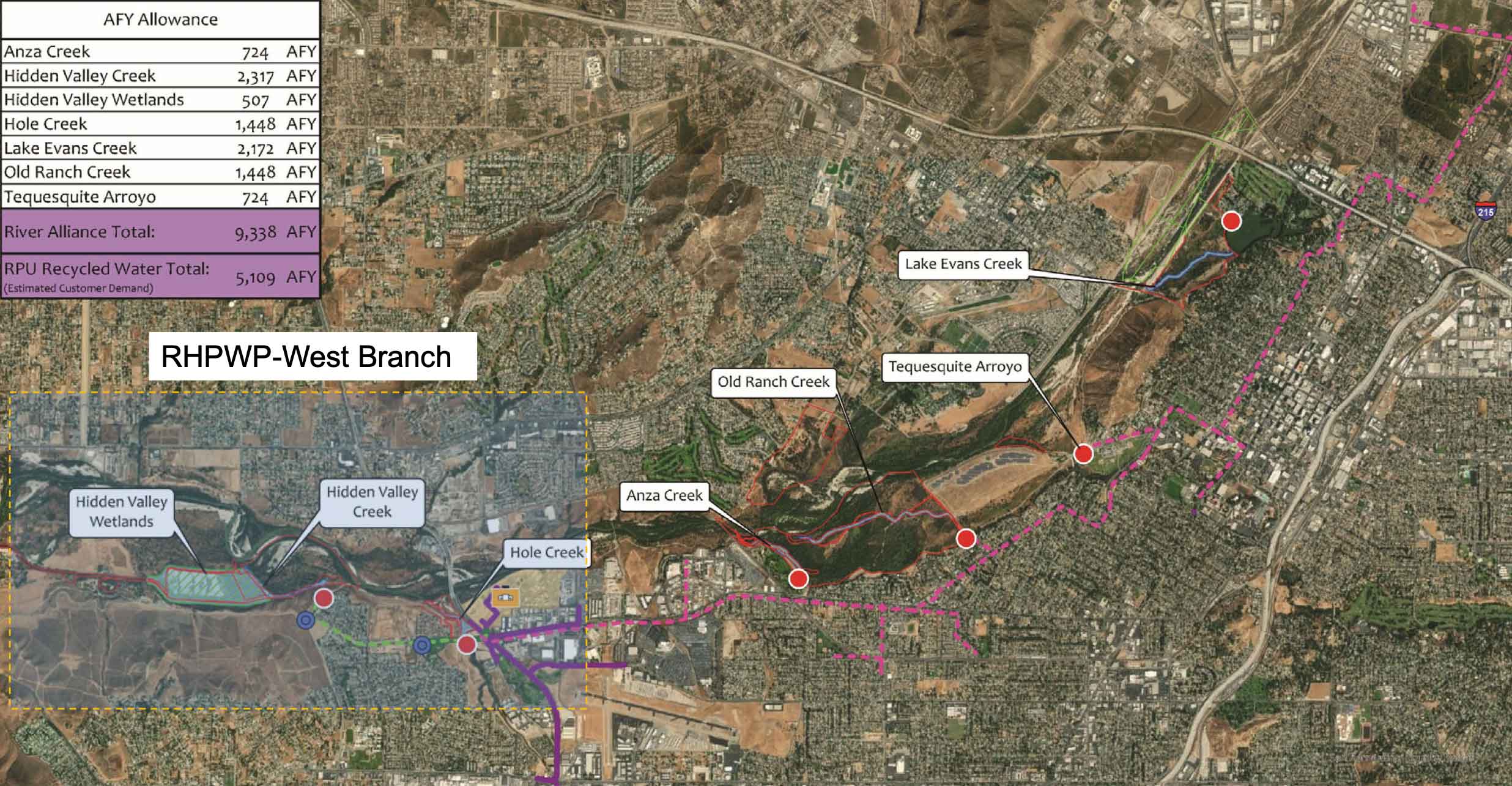 In March of 2022, a request for proposal for construction documentation said the Valley District and RPU "are working together to provide an innovative approach for a long-term, reliable water source to sustain habitat restoration in tributaries to the Santa Ana River, as well as provide irrigation water to several facilities in the City of Riverside including parks.