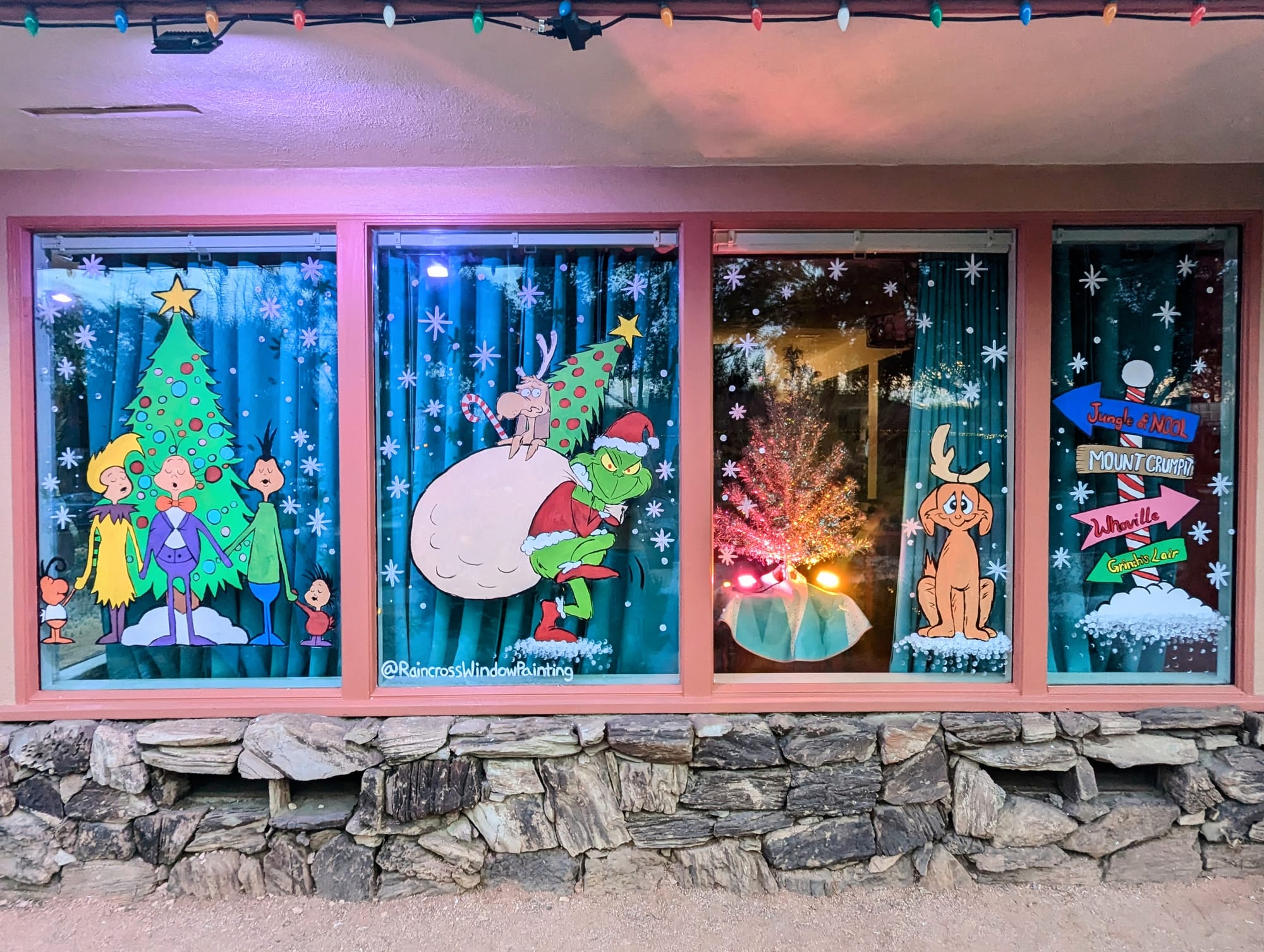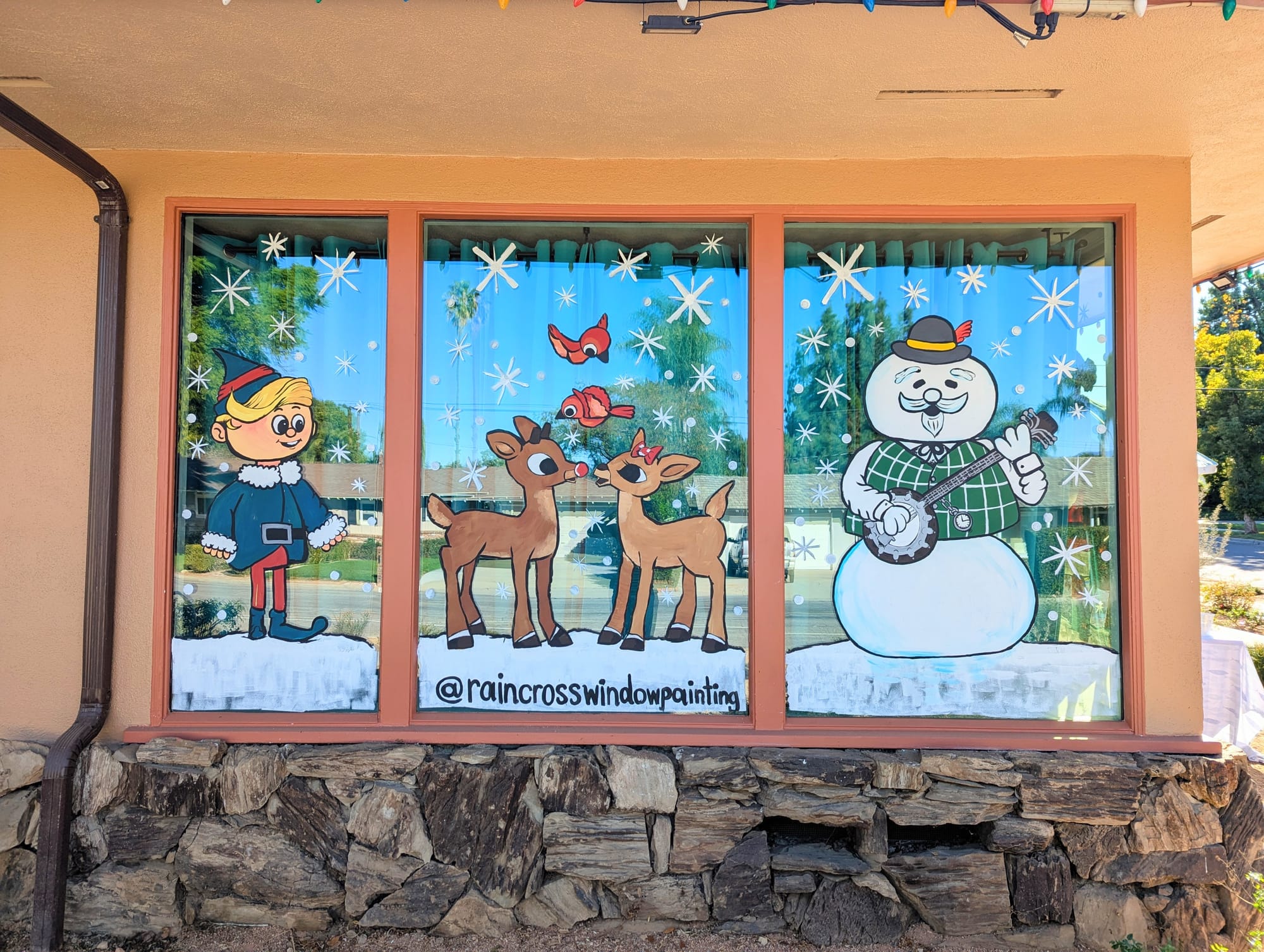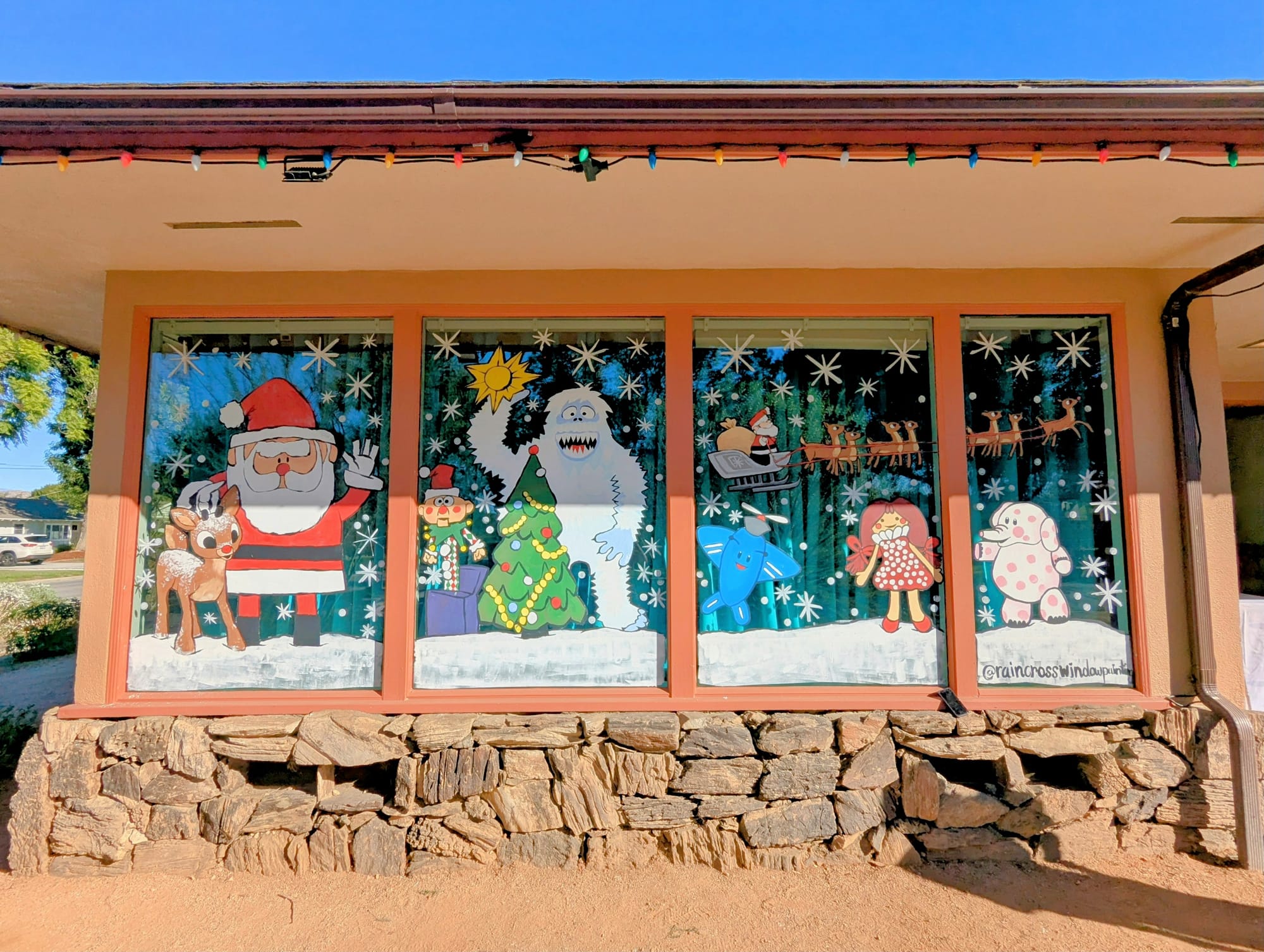 Raincross Window Painting's holiday designs transform neighborhood windows into nostalgic winter scenes. The trio has completed Charlie Brown, Grinch and Rudolph themes over three years at Kim Marlowe Beckwith's mid-century home. (Courtesy of Raincross Window Painting)