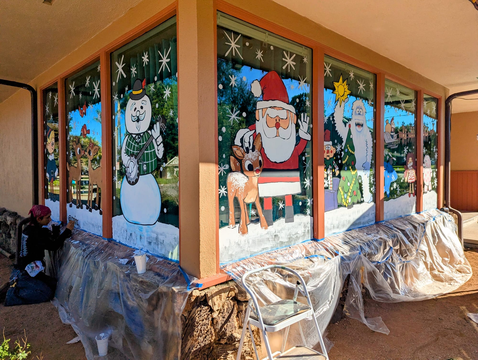 This year's project features a Rudolph the Red-Nosed Reindeer design across Marlowe Beckwith's mid-century home windows. The front window shows Santa with Rudolph, while another panel depicts the Yeti placing a star on the tree surrounded by Misfit Toys. Above, Santa flies across the sky, creating a connected narrative across the glass.