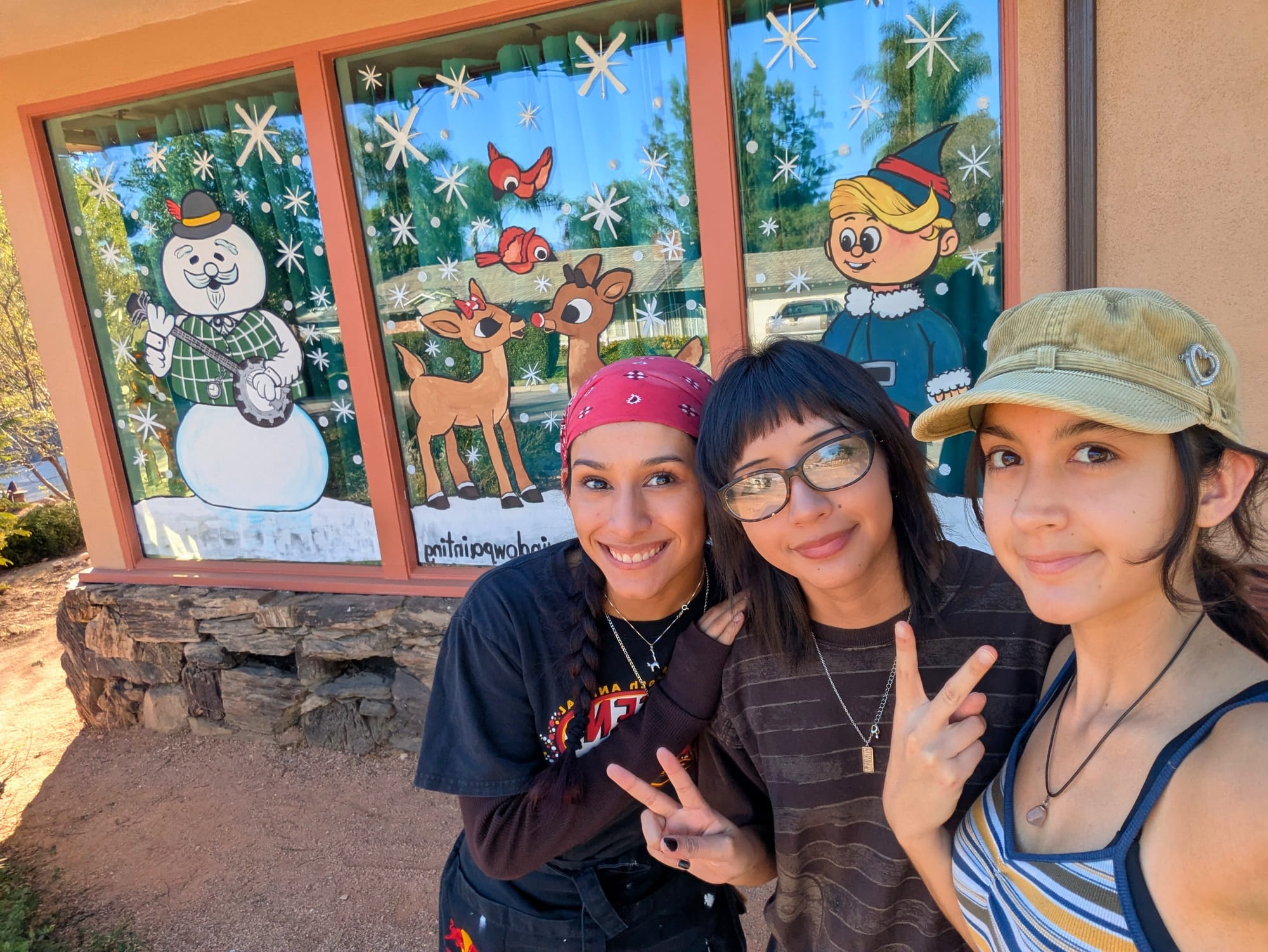 Ariel, Jewell and Felicity—all Poly High graduates—launched Raincross Window Painting three years ago after their former teacher, Kim Marlowe and her husband Ted Beckwith, asked if they could paint their windows during Thanksgiving break. What started as a Charlie Brown tribute has evolved into an annual tradition and a small business.
