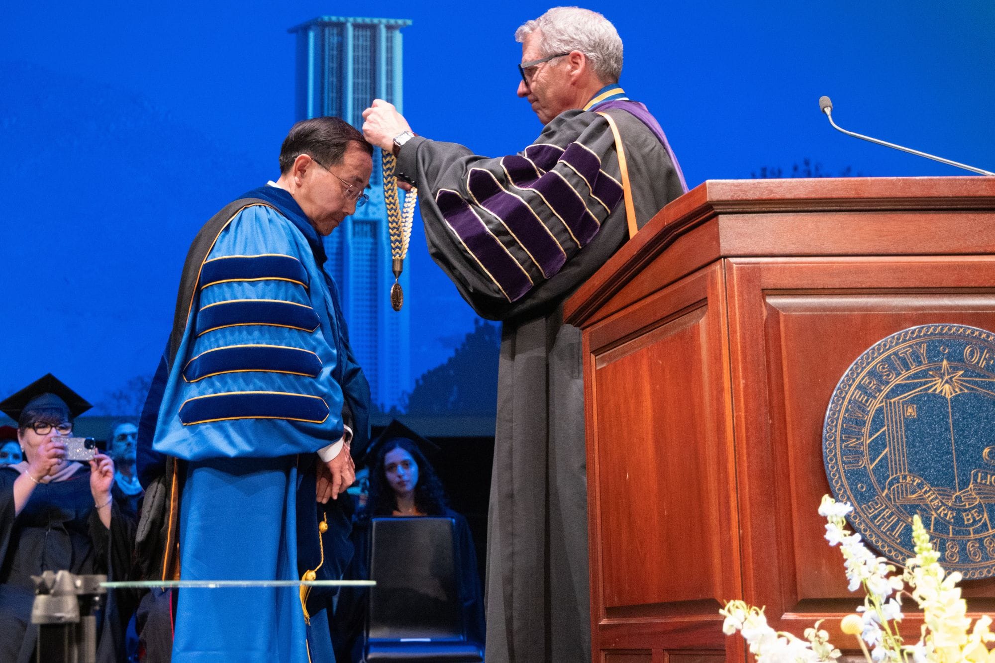 Next, it was time for the installation ceremony. James Milliken, president of the University of California system, gave a brief address. Then he formally declared Hu the 10th chancellor of the University of California Riverside.