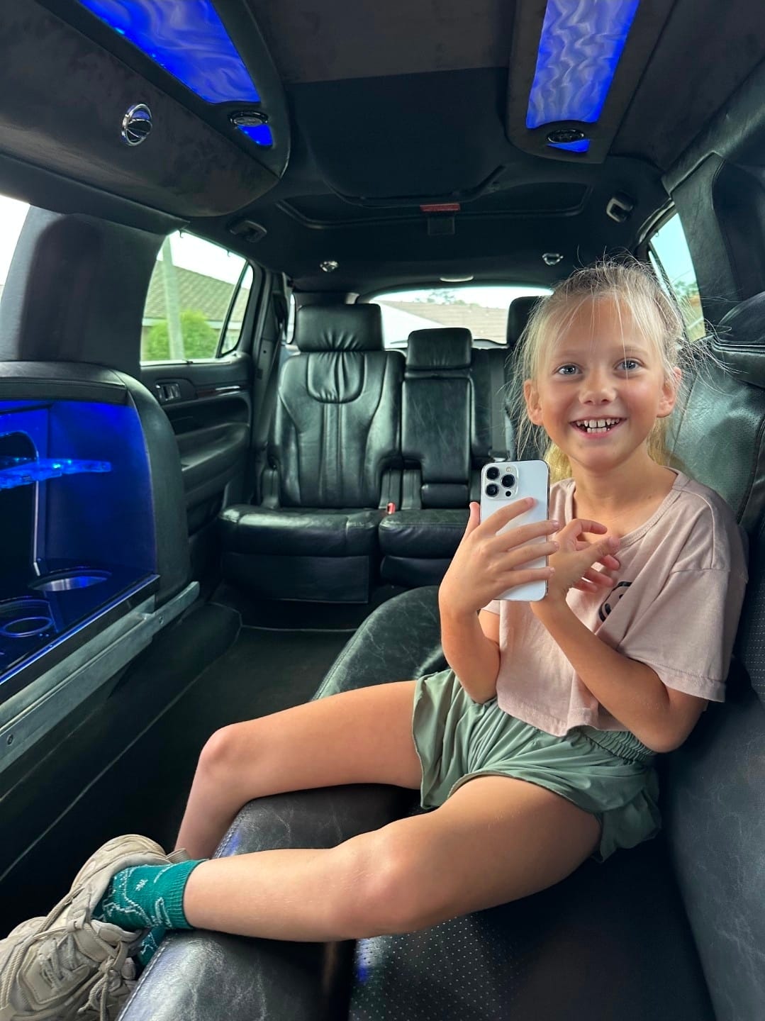 Meliia steps into the stretch limousine that took her family to Disneyland, smiling from ear to ear as her community-supported dream trip becomes reality. (Courtesy of Alina Kondakova)