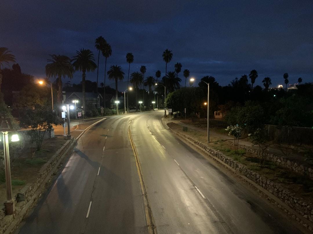6am view from Buena Vista Bridge overlooking Mission Inn Avenue - street lights illuminate the empty roadway as dawn approaches. (Karl Moet)